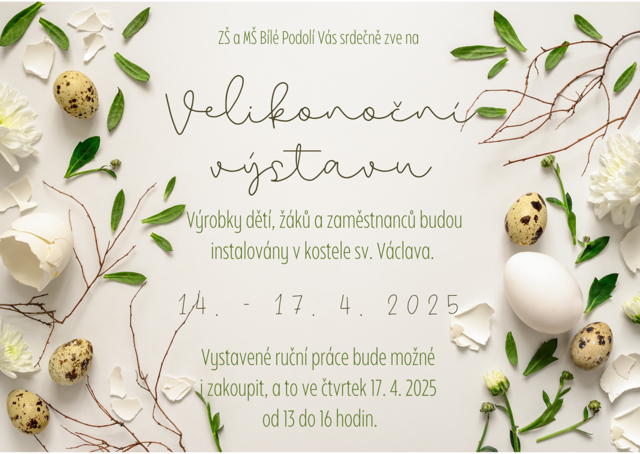 Základní a Mateřská škola Bílé Podolí Vás srdečně zve na velikonoční výstavu výrobků dětí, žáků a zaměstnanců školy. Výstava se uskuteční v kostele sv. Václava v Bílém Podolí od 14.-17.4.2025.